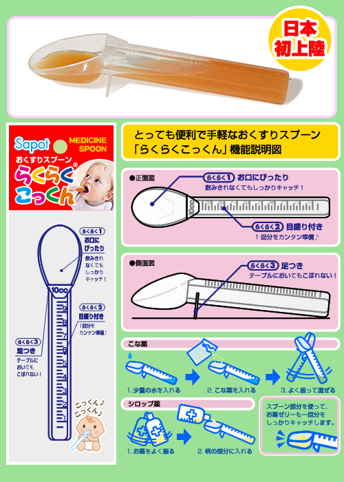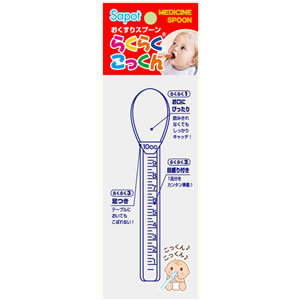 赤ちゃんにお薬を飲ませるために開発された投薬専用スプーンです。スプーン部分が赤ちゃんのお口にしっかりフィットするよう深く丸くなっています。目盛り付きの柄の部分の容量は10mLあり、通常1回分のお薬が全部入ります。足がついているのでお薬が入ったまま置いてもこぼれません。